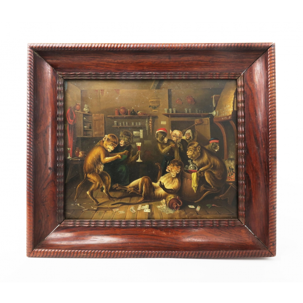 Museum Quality Oil On Copper Painting Depicting An Interior With Drunk Monkeys Fighting Over Card Game.