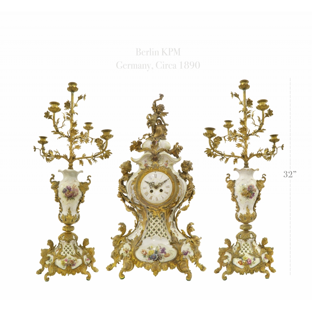 19th C. Ormolu Mounted Berlin KPM Porcelain Clock Set. Circa 1890