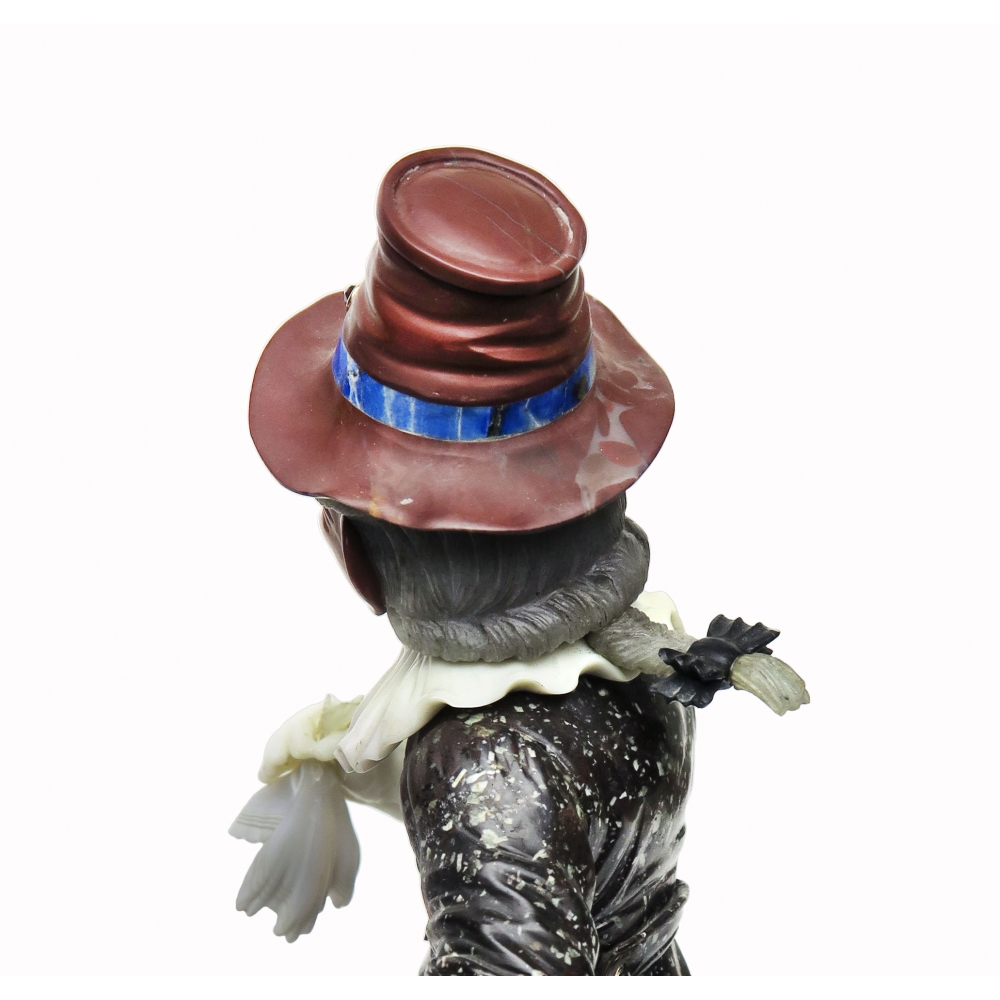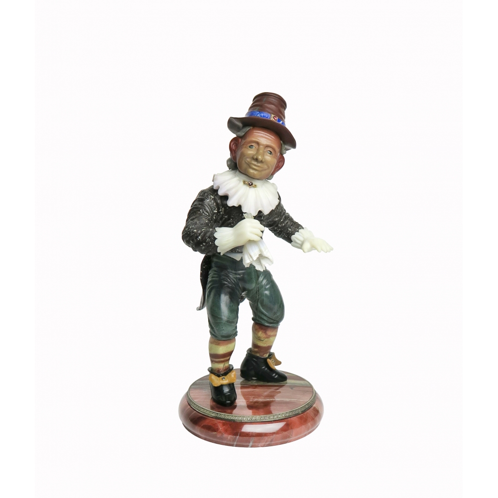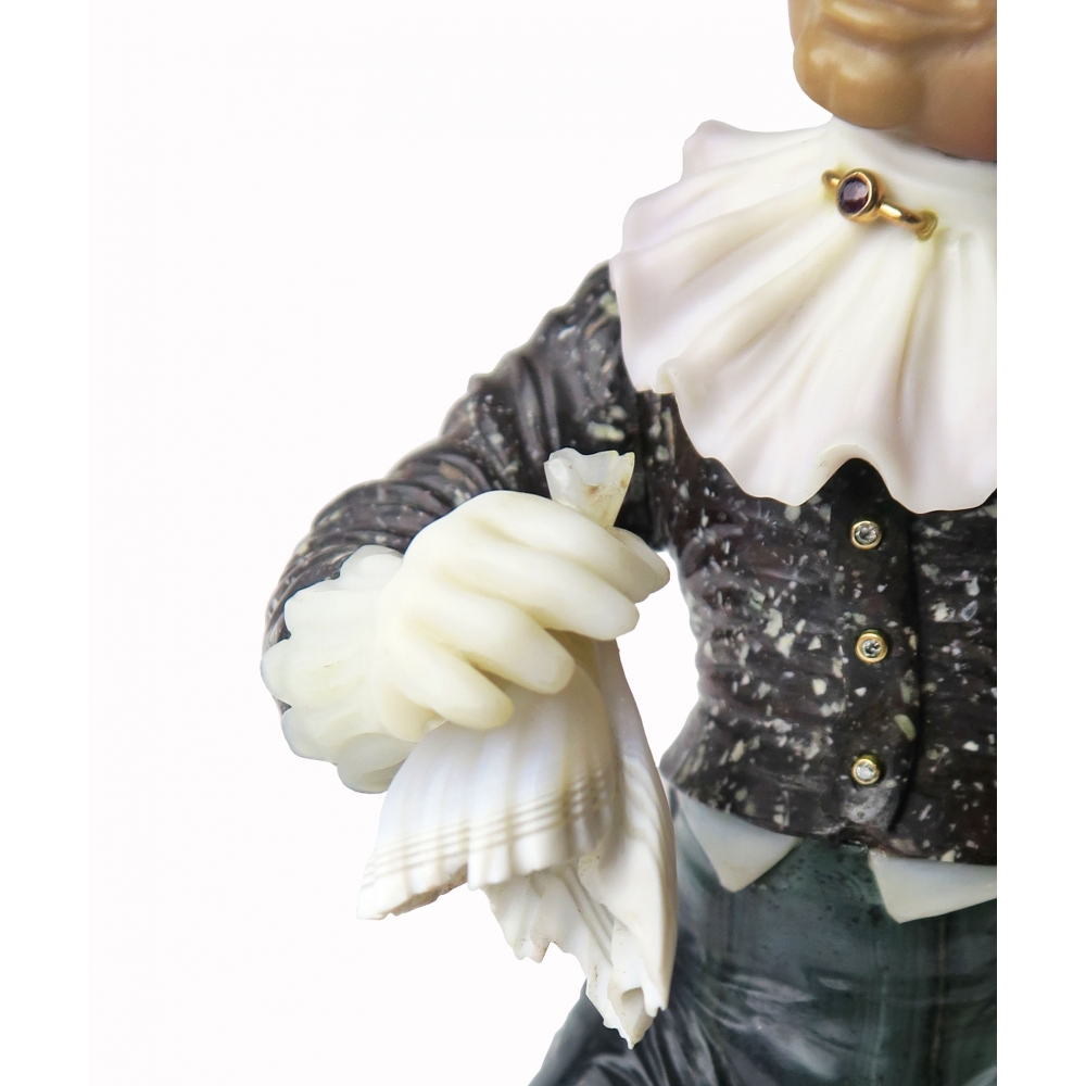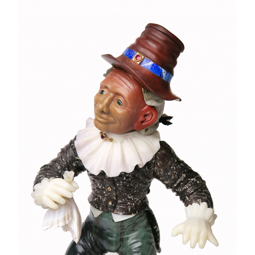 Perhaps the greatest sign of the skill of the lapidary artist is in the execution of the white glove which holds the white handkerchief--cut from the same piece of rough--the handkerchief is moveable upon touch. The rest of the figure comprises a variety of gemstones, most of which originate in Russia and include the following: the hat carved of brown jasper with inset lapis lazuli head band accented with a faceted ruby and gold adornment; the face, carved of light brown jasper using the natural graduation in color of the mineral to suggest reddish ears; the wig, of grey quarzite; the collar, cuff, gloves and handkerchief and eyes of white kascholong opal; the jacket of brown brecciated jasper; the trousers, of green jasper; the socks of brown banded jasper, and the shoes of black obsidian. Raised on a circular red jasper base. This is a unique object, created as an edition of one. Height 8 1/4in